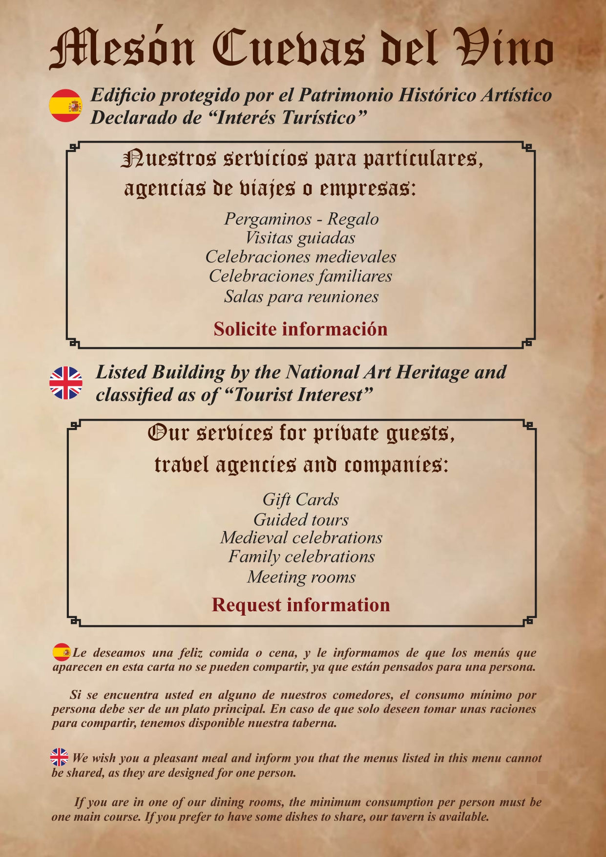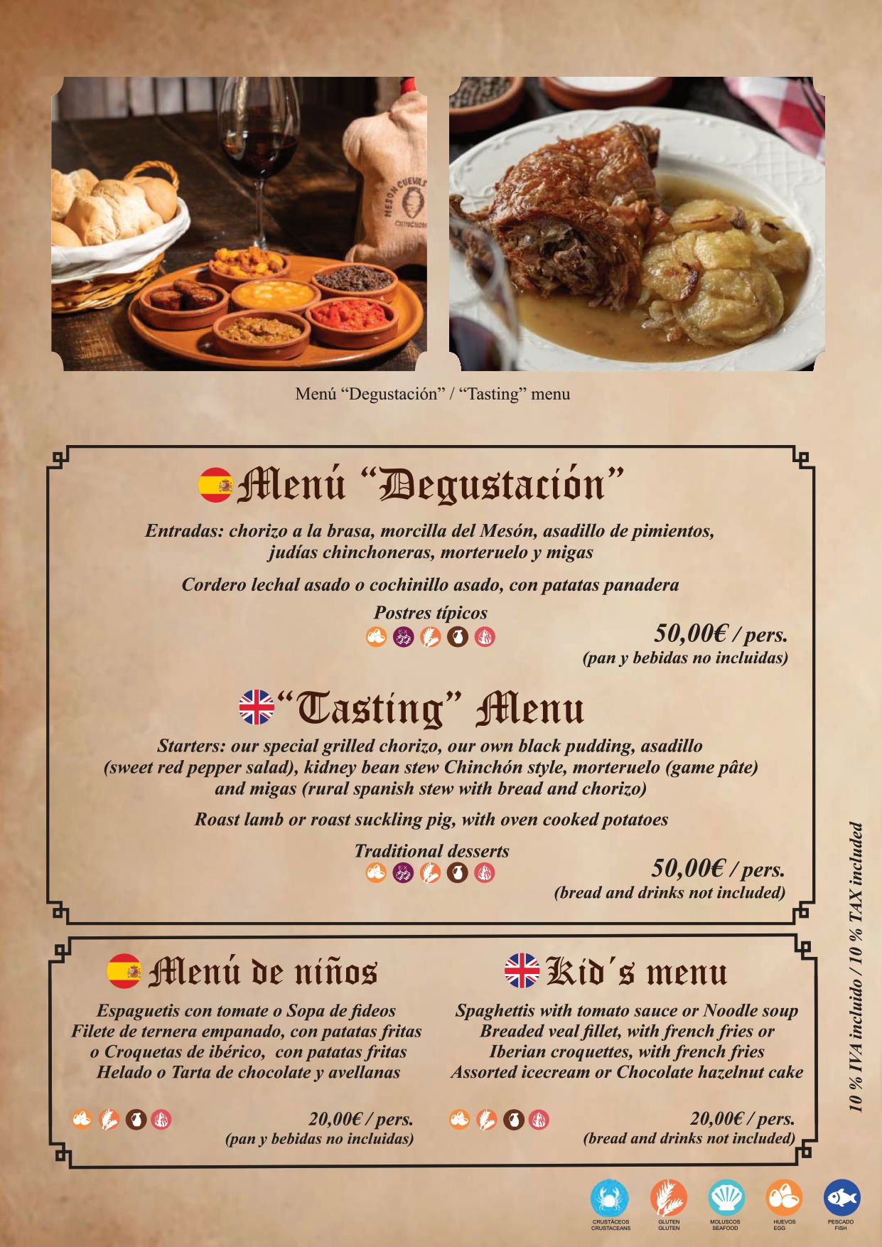 Recomendamos nuestro «Menú degustación», que consta de un primer plato con seis entrantes representativos del Mesón, de un segundo plato a elegir entre cordero lechal y cochinillo asado al horno de leña, y un postre con tres miniaturas de nuestros postres más típicos.