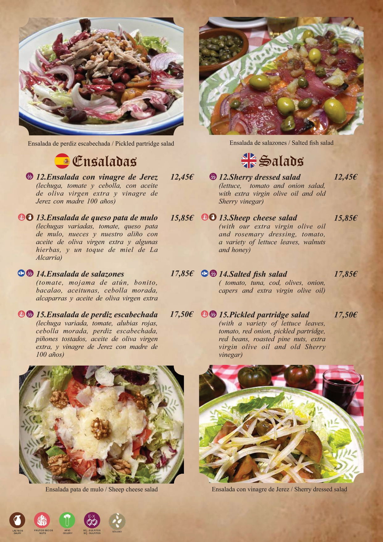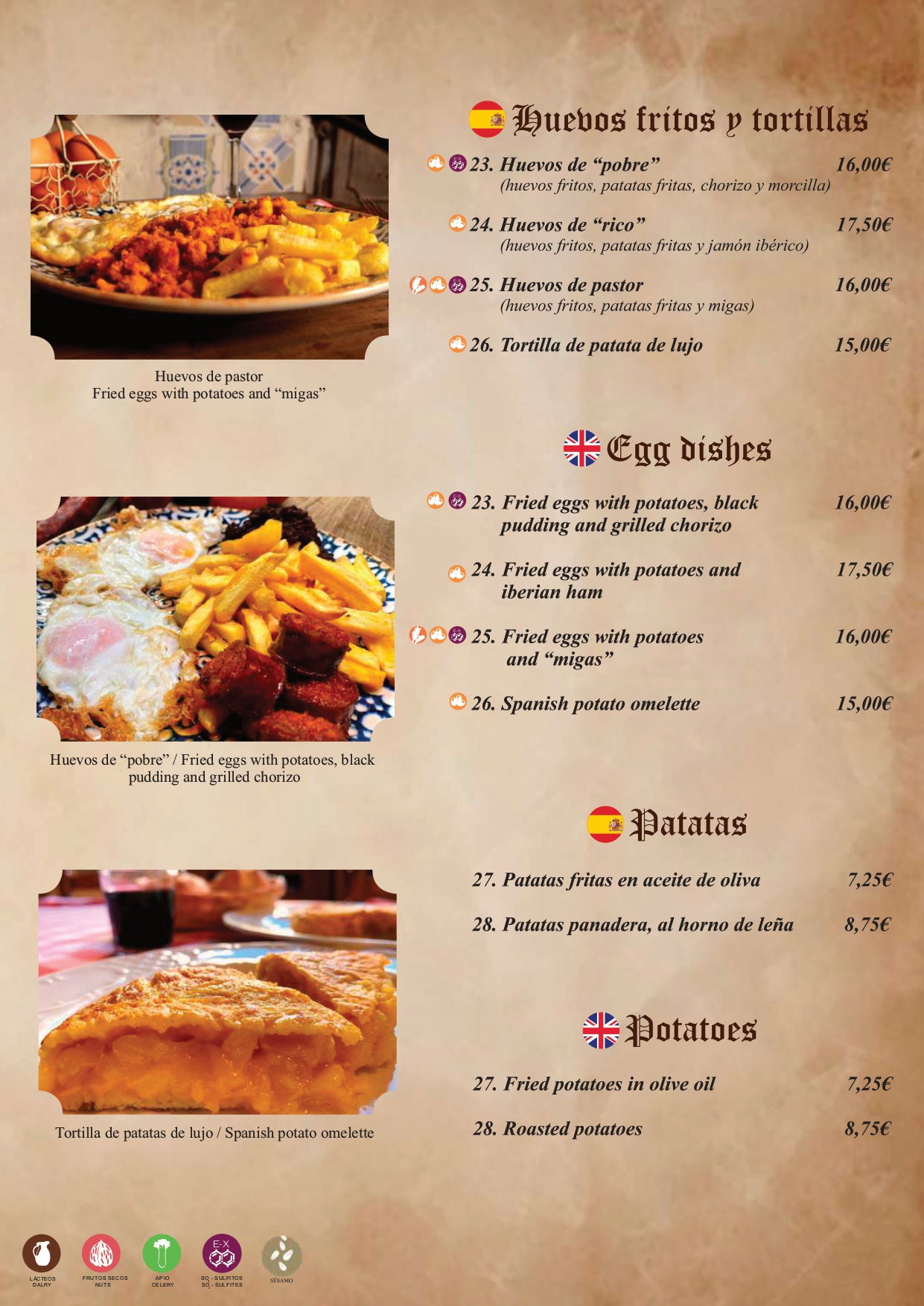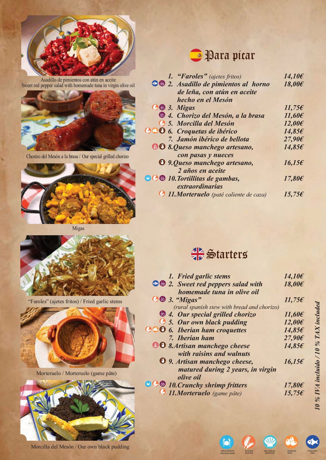 Como entrantes más típicos de nuestra carta, puede usted encontrar el chorizo del Mesón a la brasa, el asadillo de pimientos con atún en aceite hecho en el Mesón, las migas, el morteruelo, la morcillla del Mesón, las croquetas de ibérico o los “faroles”. Y para los más tradicionales y clásicos, la tortilla de patata “de lujo”.