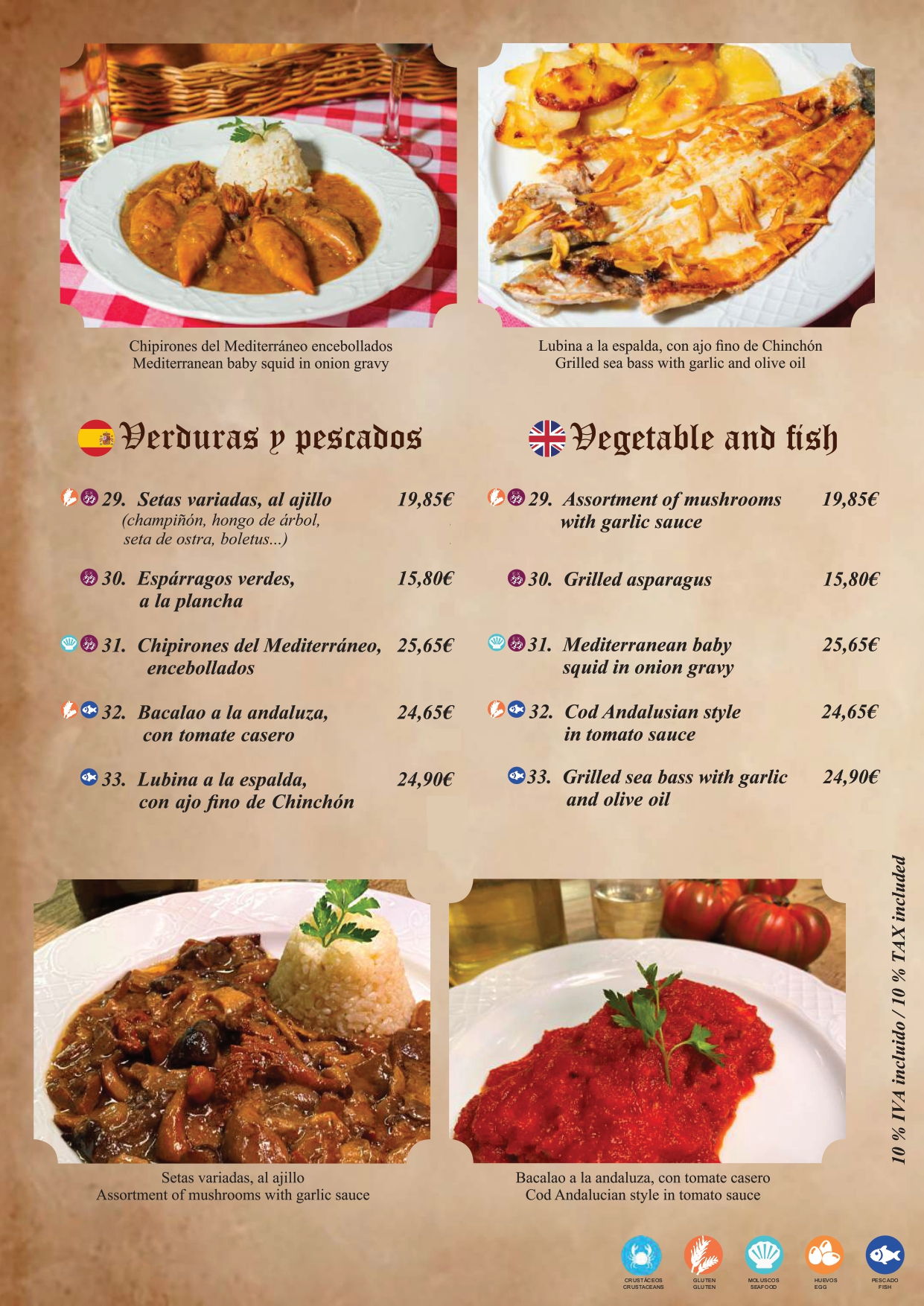 No somos un restaurante de pescados, pero los que hacemos, los hacemos bien. Nuestras gambas rojas al ajillo son una exquisitez. Las tortillitas de gambas son extraordinarias. La lubina a la espalda con ajos finos de Chinchón, es un placer para el paladar. Al igual que el bacalao con tomate casero, para mojar pan y no parar.