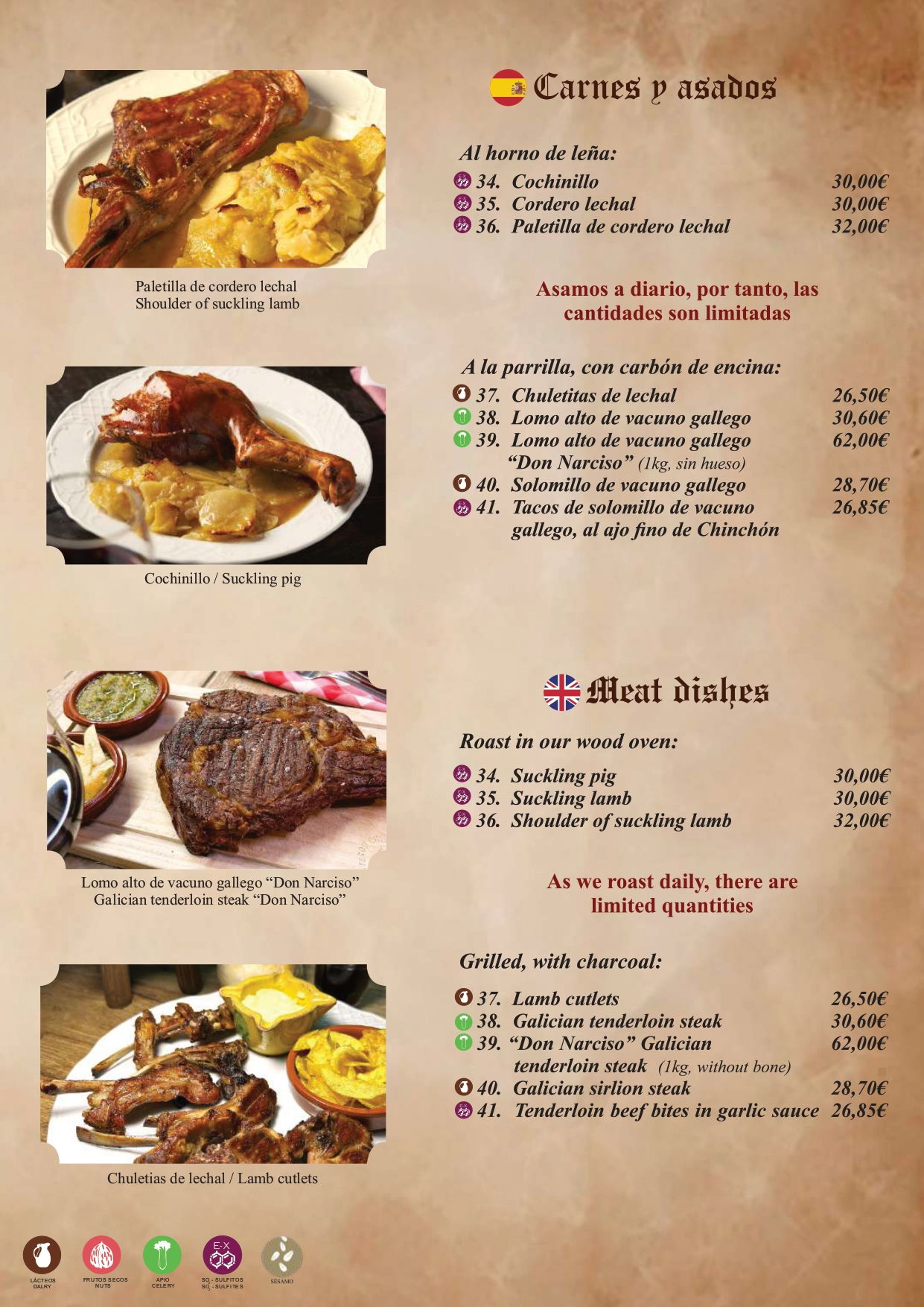 Nuestra cocina tiene como especialidad los asados al horno de leña; cordero lechal y cochinillo. Complementan la carta los guisos y las carnes rojas a la parrilla, entre los que destacan la sopa del Mesón, las judías Chinchoneras, los callos al estilo de Chinchón, el rabo de toro o el lomo alto «Don Narciso», en homenaje al creador del Mesón.