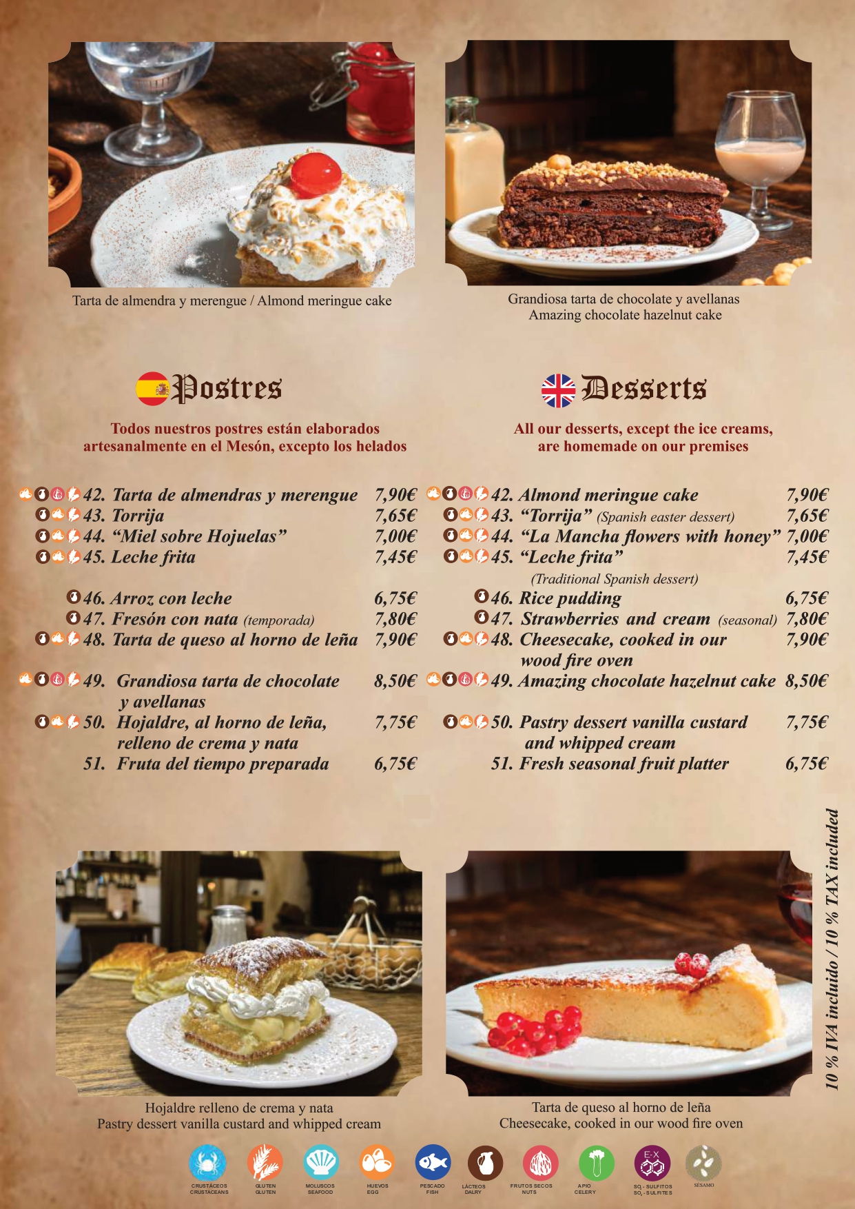 En la sección de postres, podemos presumir de que todos ellos son elaborados en la casa. Recomendamos especialmente la miel sobre hojuelas, la leche frita, la tarta de almendras y merengue, la tarta de queso o nuestra grandiosa tarta de chocolate y avellanas.
