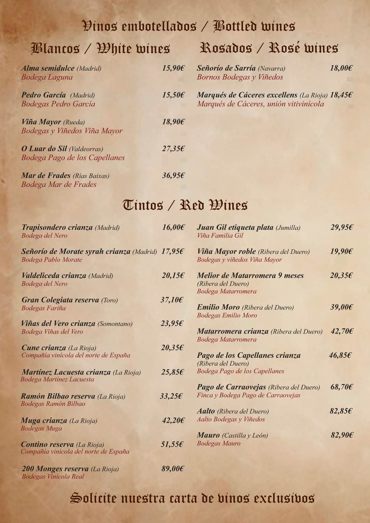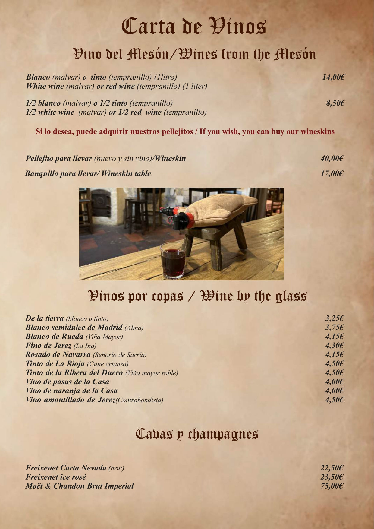 En cuanto a los vinos, tenemos una corta pero selecta oferta. El vino de la Casa, joven de la tierra, se lo servimos en pellejitos, elaborados a mano con piel de cabra.